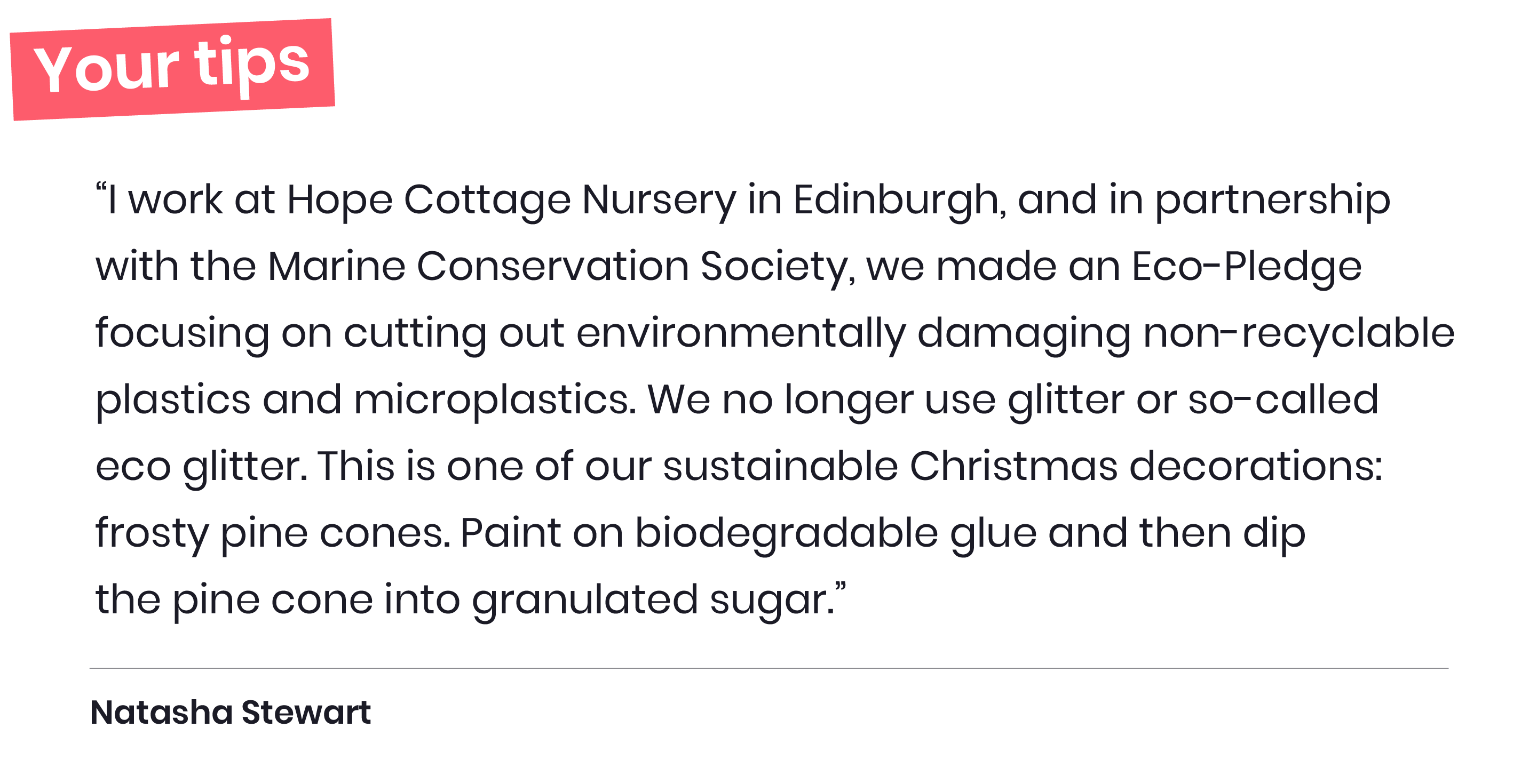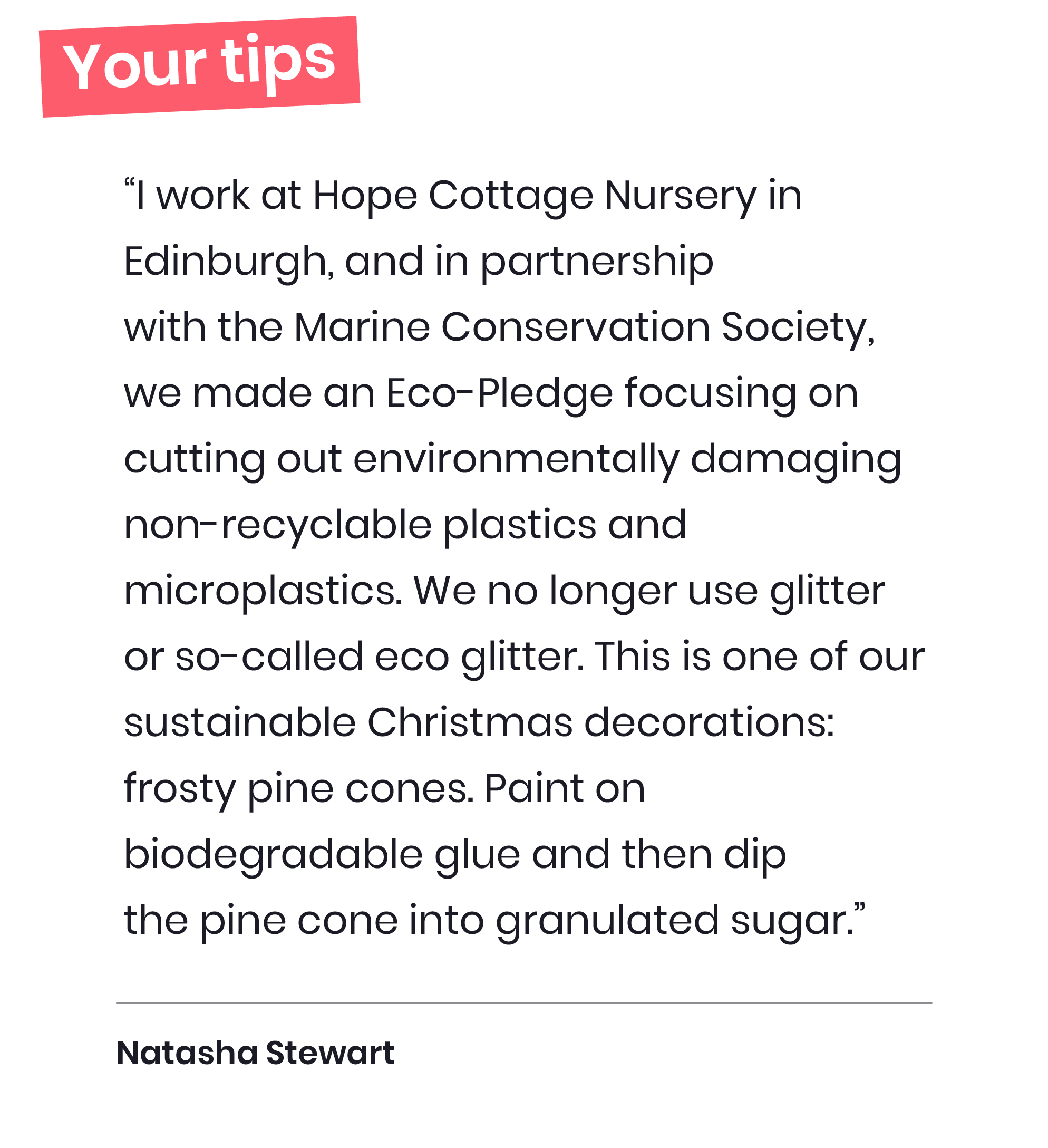 Once washed down the plughole and into our water systems, glitter can end up in the ocean. Even those labelled biodegradable aren’t necessarily healthy for our environment, so try to avoid these shiny microplastics. Beware of glitter in oats sold as ‘reindeer food’ which children are encouraged to sprinkle on the lawn on Christmas Eve. Use a hole punch to cut fallen leaves into pretty confetti discs for a natural alternative. Any cards embedded with glitter can’t be recycled either.